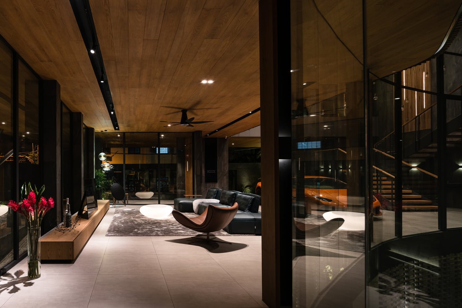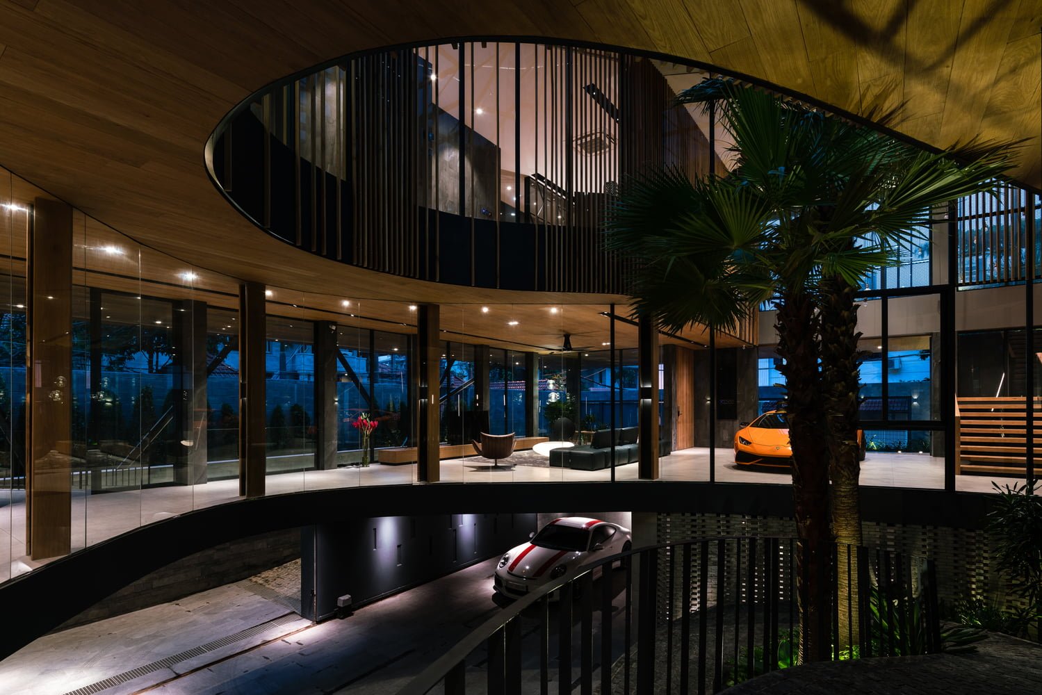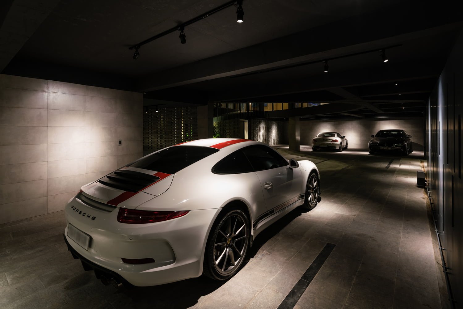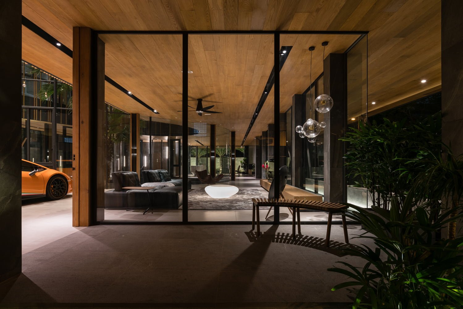 Với niềm đam mê xe hơi của gia chủ, cộng với diện tích hơn 1000m2 , Công ty VACODESIGN đã thiết kế hầm để xe mở hoàn toàn với sân trong. Tạo sự thông thoáng, giảm bớt mùi khói xe và giúp gia chủ có thể thoả thích ngắm những chiếc xe của mình. Kiến trúc giải phóng hoàn toàn không gian tầng trệt khỏi những bức tường bê tông , thay vào đó là giải pháp kính, tạo ra một tổng thể không gian vô cùng hài hoà và rộng mở.