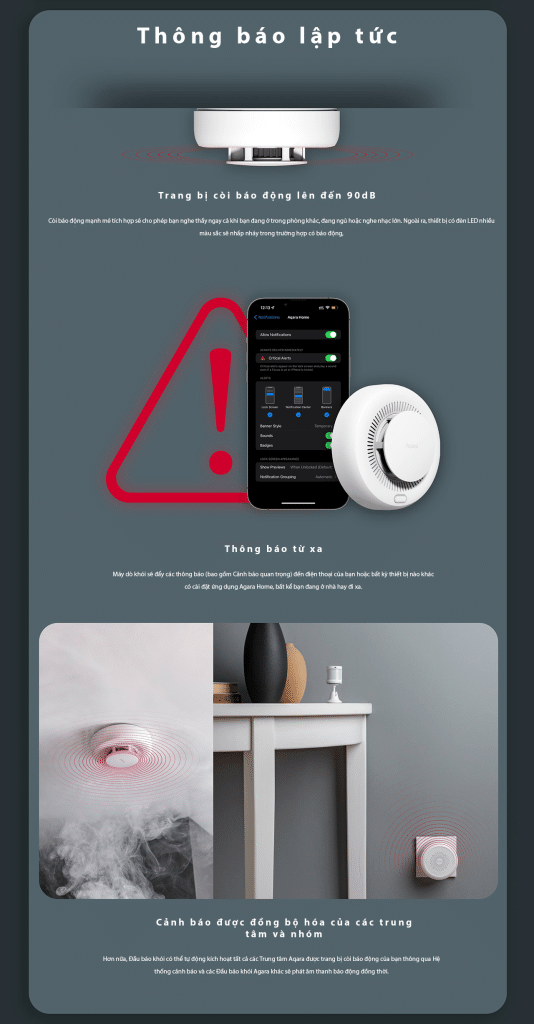 - Đặc biệt, khi kết nối với hub có chuông báo như AQARA M1S. Trong trường hợp có khói, báo cháy thì Báo khói AQARA sẽ kết hợp cùng hub sẽ hú cảnh báo gia chủ