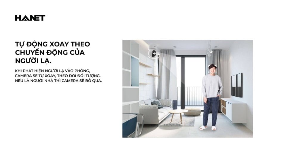 Được trang bị công nghệ trí tuệ nhân tạo đột phá cùng khả năng nhận diện và ghi nhớ đặc điểm nhận dạng về khuôn mặt, hình dáng, HANET AI Cam Home dễ dàng tìm kiếm và trích xuất lịch sử chi tiết của người cụ thể. Khi phát hiện người lạ vào nhà, Camera sẽ tự động xoay, theo dõi đối tượng.