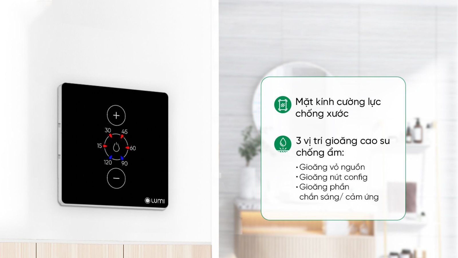 Công tắc thông minh của Lumi được thiết kế với khả năng chống ẩm tốt nhất thị trường nhờ vào ba vị trí gioăng cao su: gioăng vỏ nguồn, gioăng nút config và gioăng phần chắn sáng/cảm ứng. Nhờ vậy đảm bảo sản phẩm hoạt động bền bỉ, ổn định ngay cả trong môi trường có độ ẩm cao như nhà tắm.