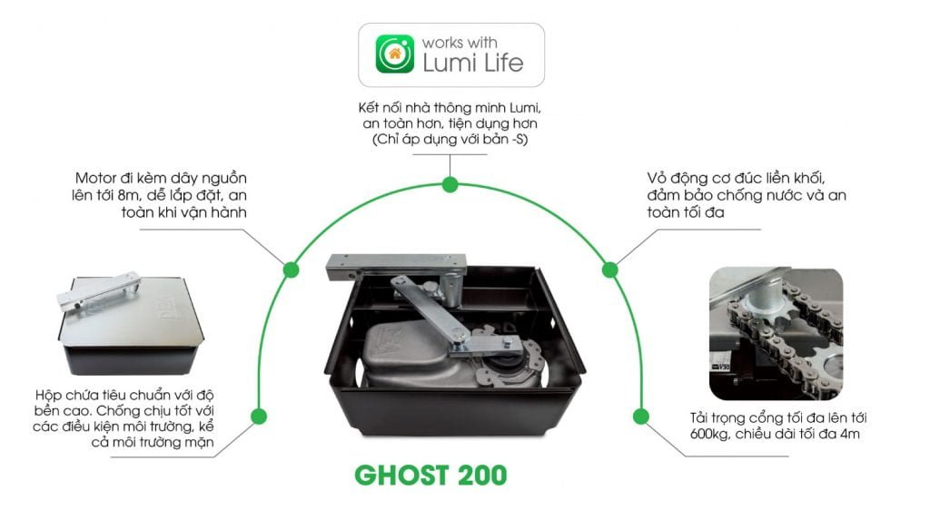 Cổng tự động âm sàn GHOST 200 có thể mở cổng với chiều dài lên đến 4m và cân nặng lên tới 400kg. Cái tên đã nói lên tất cả “GHOST”: Động cơ này hoàn toàn được ẩn dưới nền cổng và hoạt động với độ chính xác và an toàn tối đa cho các thành viên trong gia đình và phương tiện ra vào cổng
