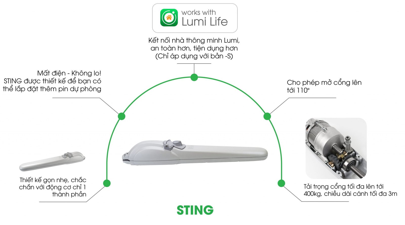 Cổng tự động STING có thể sử dụng cho cổng xoay của biệt thự hoặc khu cơ quan. Động cơ này có thể tải được cổng nặng tới 400kg với chiều dài tối đa 3m, phù hợp với phần lớn nhu cầu sử dụng trong thành phố.