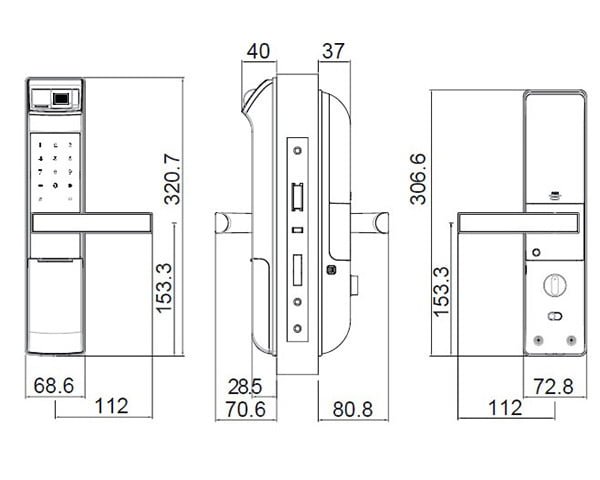 Kích thước mặt trước khóa: (Rộng) 68.6 mm x (Cao) 320.7 mm x (Dày) 40 mm